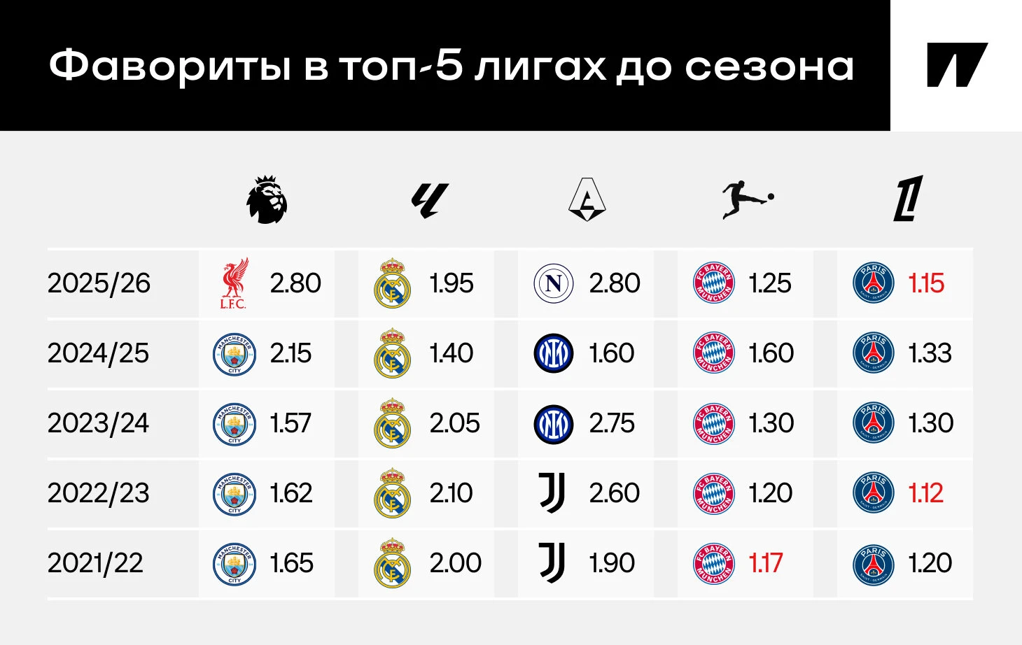 От Англии, Испании и Италии подобные расклады очень далеки. В АПЛ даже «Манчестер Сити» на пике ни разу не падал ниже коэффициента 1.50. Странный расклад был в прошлом сезоне в Ла Лиге: «Реал» предлагался в диапазоне 1.37-1.40. Считалось, что трансфер Килиана Мбаппе сделает разницу, а «Барселона» будет только строиться в первый сезон с Ханси Фликом.