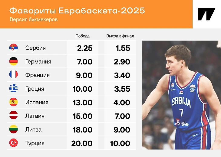 Конкурентов у Сербии не так уж много. Ожидалось, что их главным соперником станет Франция, но они приедут без Виктора Вембаньямы, Руди Гобера и Эвана Фурнье. Так что вторым фаворитом букмекеры видят действующих чемпионов мира – Германию. Французы котируются третьими. Греция – четвертый фаворит. Яннис Адетокумбо – главная надежда сборной, не бравшей медали крупных турниров с 2009-го.