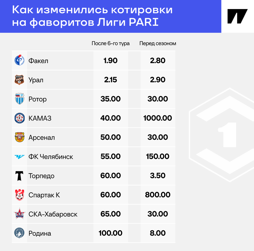 Перед сезоном букмекеры видели у «Факела» и «Урала» двух конкурентов – «Торпедо» (3.50) и «Родину» (8.00). Однако оба московских клуба набрали по четыре очка и теперь даже не в топ-5 фаворитов. Ближе всех к воронежцам и екатеринбуржцам по кэфу – «Ротор» за 35.00!