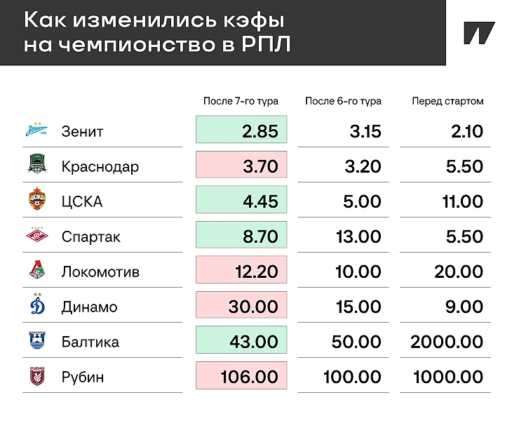 ● Парни Сергея Семака снова лидируют с запасом над «Краснодаром», хотя неделю назад чуть не произошел исторический прецедент: «быки» могли возглавить гонку у букмекеров уже летом. Пока «Зенит» успокоил ситуацию.