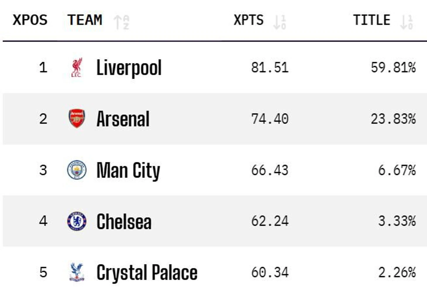 Суперкомпьютер Opta видит существенные изменения в гонке: «Ливерпуль» – чемпион на 60%. «Арсеналу» оставляют 23%, а «Ман Сити» теперь не дотягивает даже до 7%! Остальных всерьез и не рассматривают. Правда, не можем пройти мимо пятого претендента на титул – «Кристал Пэлас». А вот шансы «МЮ» упали до 0,21%.