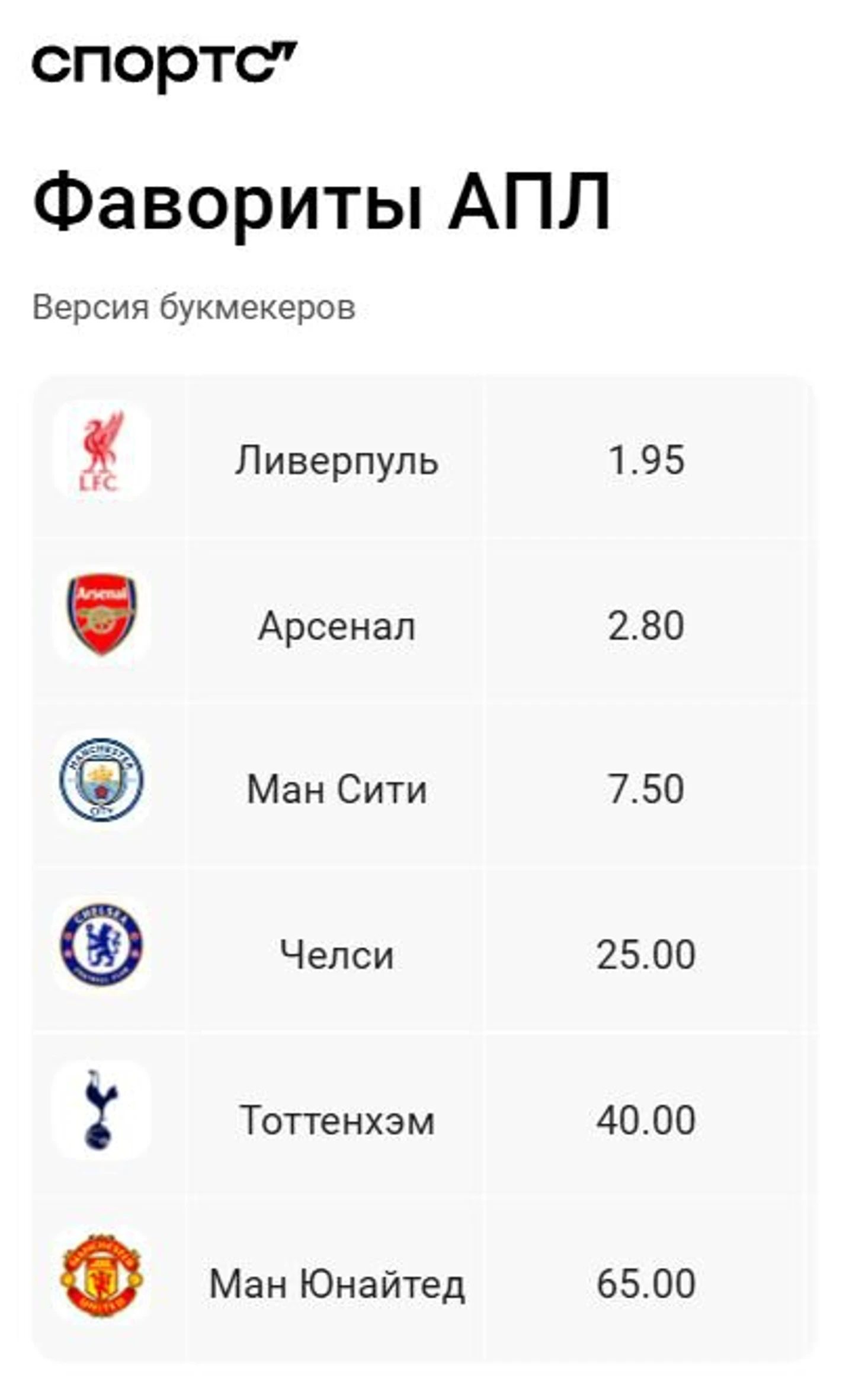 А еще существенная разница в отношении к «Манчестер Юнайтед». Суперкомпьютер сбросил их аж на 12-е место, у букмекеров «МЮ» – шестой с коэффициентом 65.00.