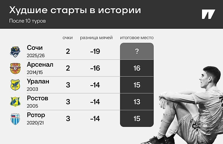 В 1998-м «Тюмень», измученная финансовыми проблемами, завершила год, набрав 8 очков, разница мячей была -72. Пока на удивление после 10 туров «Сочи» превосходит исторический график аутсайдера.