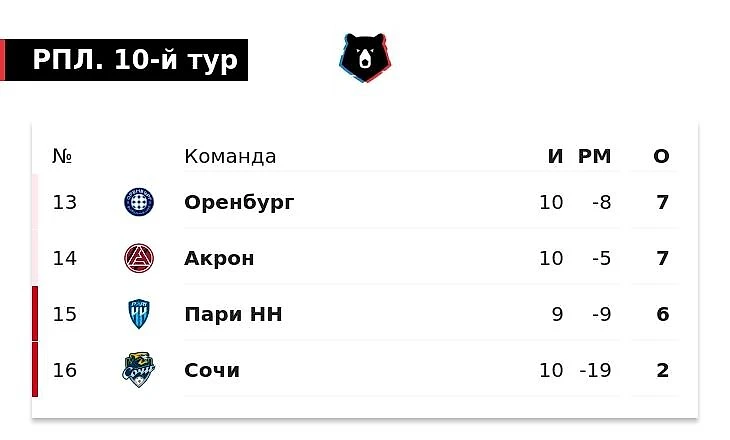 В среднем для 14-го места обычно хватает 30 очков. То есть при очень грубом расчете – «Сочи» фактически нужно побеждать в каждом втором матче: 10 побед – 30 очков. За счет ничьих уже спастись будет почти невозможно, учитывая отставание и относительно живых конкурентов.