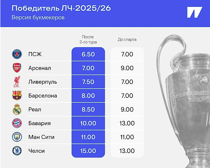 Поражение «Барселоны» дома от «ПСЖ» – важный сигнал для аналитиков. Расклады на чемпиона оперативно поменялись. Лига чемпионов-2025/26 до старта была самой запутанной в XXI веке – сразу три фаворита с одинаковыми коэффициентами. Теперь грандов впервые расположили друг за другом – есть единоличный лидер!