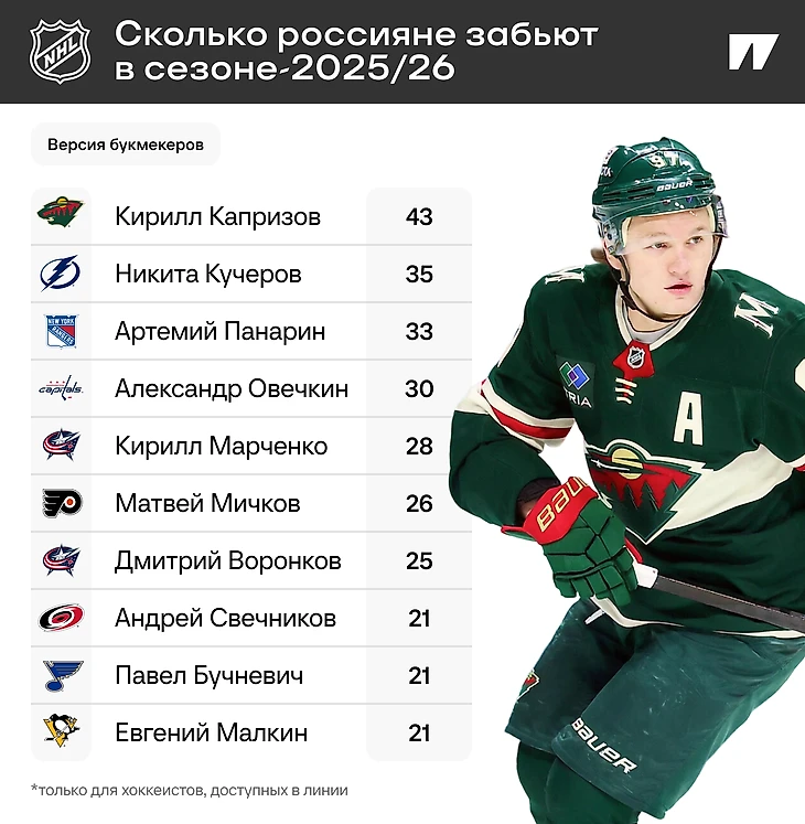 Аналитики полагают, что из россиян за звание лучшего снайпера может побороться только Кирилл Капризов. Форвард «Миннесоты» стоит в общей линии третьим с коэффициентом 6.50. Выше только Остон Мэттьюс и Леон Драйзайтль.