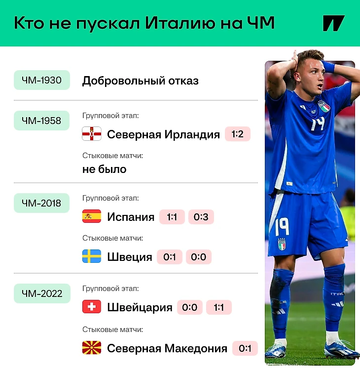 Италия до провала в квалификации на ЧМ-2018 участвовала во всех турнирах, начиная с 1958 года. До ЧМ в России итальянцам объективно не повезло с жеребьевкой – причем два раза: в группе уступили первое место Испании, а в стыковых матчах попали на крепкую Швецию.