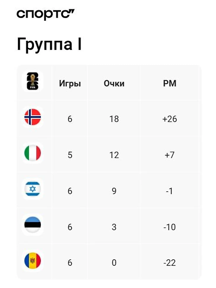 Первый показатель при равенстве очков – разница мячей. Тут уже катастрофа для Италии: у Норвегии преимущество +19, а еще есть игра дома с Эстонией.