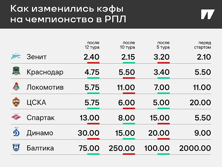 Место в медалях: на старте крепко держалось за «Зенитом», «Краснодаром» и «Спартаком», но после пяти туров спартаковцев в этом списке заменил ЦСКА. Перед 12-м туром не было сомнений только в «Зените» (коэффициент 1.15), на ЦСКА, «Локомотив», «Краснодар» и «Спартак» давали в диапазоне от 1.55 до 2.60 – действительно близко. «Рубин» появился на несколько туров (не ниже 17.00), а «Балтика» теперь в таких раскладах участвует регулярно (минимум 15.00).