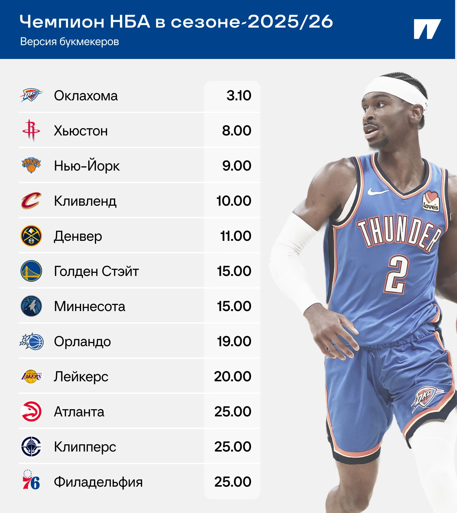 За «Хьюстоном» идут «Нью-Йорк» (9.00), «Кливленд» (10.00) и «Денвер» (11.00). Финалист «Индиана» начнет сезон только в конце топ-20 фаворитов (70.00). Без Тайриза Халибертона даже приблизиться к достижению прошлого сезона будет трудно.