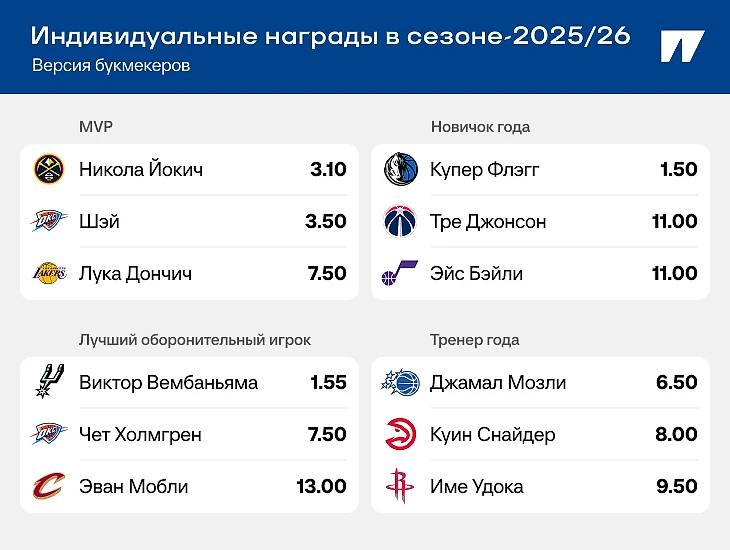 Еще одна награда, где интрига минимальна, – лучший оборонительный игрок. Виктор Вембаньяма был главным претендентом и в прошлом сезоне, но не доиграл из-за травмы. Теперь у него вторая попытка за 1.55.
