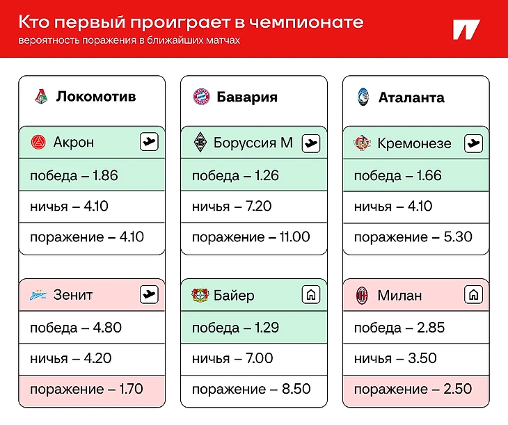 К концу октября в европейских чемпионатах непобежденных команд почти не осталось. В топ-5 лигах и Мир РПЛ таких всего три: «Бавария», «Аталанта» и «Локомотив». Получается своеобразное мини-соревнование – кто первым сорвется с беспроигрышной серии?