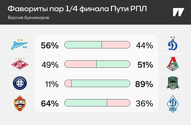 У «Оренбурга» почти нет шансов с «Краснодаром», ЦСКА должен без проблем проходить «Махачкалу». «Зенит» – фаворит против Динамо, а главная заруба ждет в паре «Спартака» и «Локомотива». Разница в котировках всего два процента