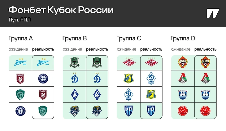 В остальных квартетах финальная расстановка полностью совпала с предсезонными прогнозами букмекеров. Хотя путь оказался неровным. В группе В московское «Динамо» до последнего билось за выход в плей-офф Пути РПЛ. В группе D ЦСКА и «Локомотив» набрали по 13 очков, но армейцы оказались выше из-за побед в двух очных матчах с «железнодорожниками».