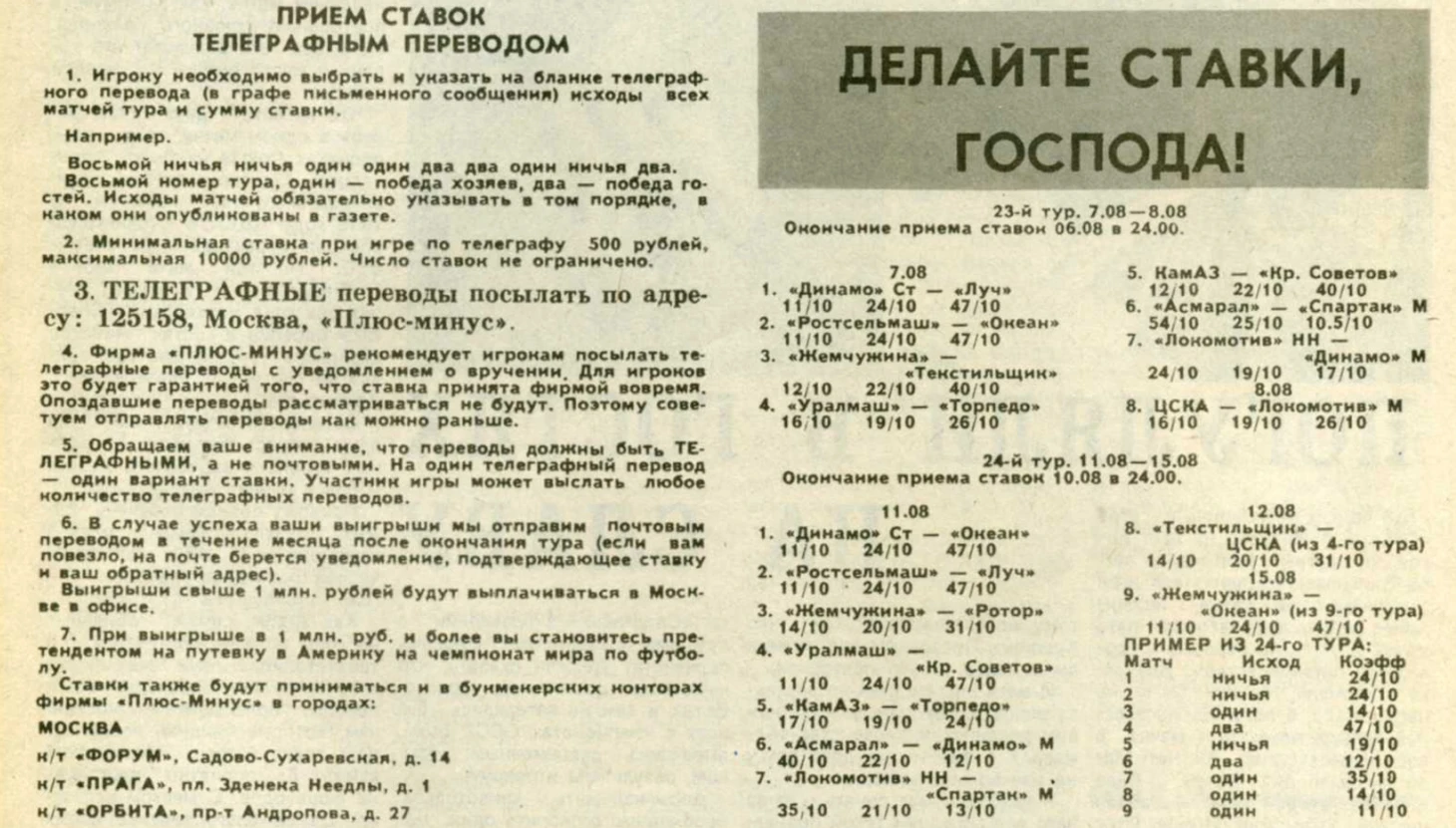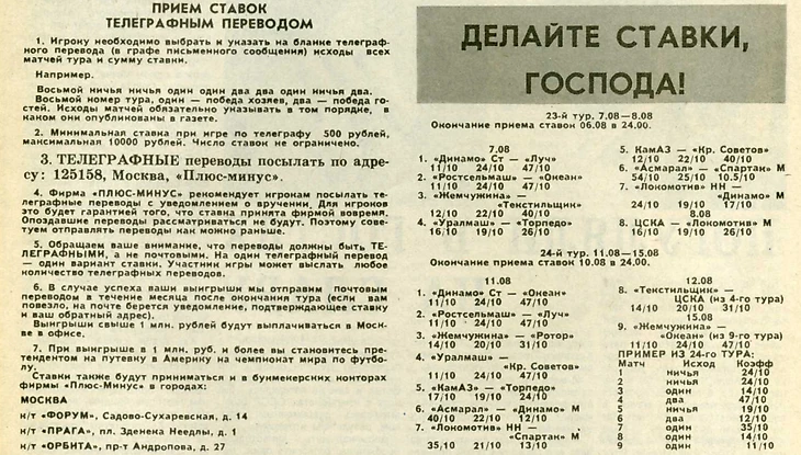 На эту игру можно даже найти коэффициенты! Тогда с Профессиональной футбольной лигой (ПФЛ) сотрудничала букмекерская компания «Плюс-Минус», так что в газетах публиковались варианты для ставок.