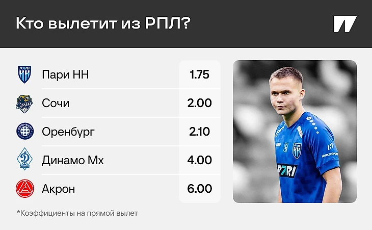 Букмекеры видят в борьбе за выживание пять команд. «Сочи» после сенсационной победы над «Ахматом» (4:2) переворачивает расклады – теперь шансов на вылет больше у «Пари НН».