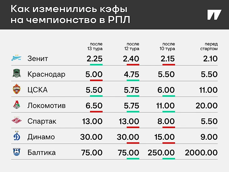 13-й тур получился долгим – только в понедельник «Ахмат» и «Сочи» выровняли таблицу. Глобальных изменений в чемпионской гонке не произошло. Букмекерские компании по-прежнему выделяют «Зенит» с большим запасом над группой преследователей из пяти-шести команд.