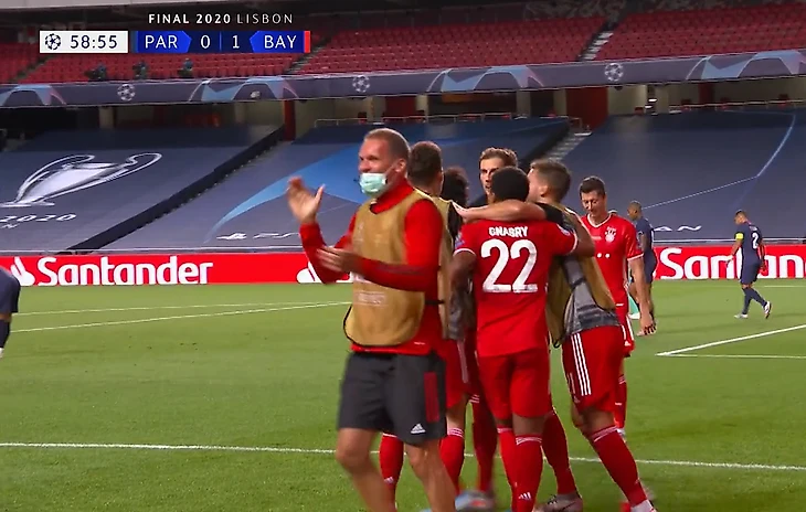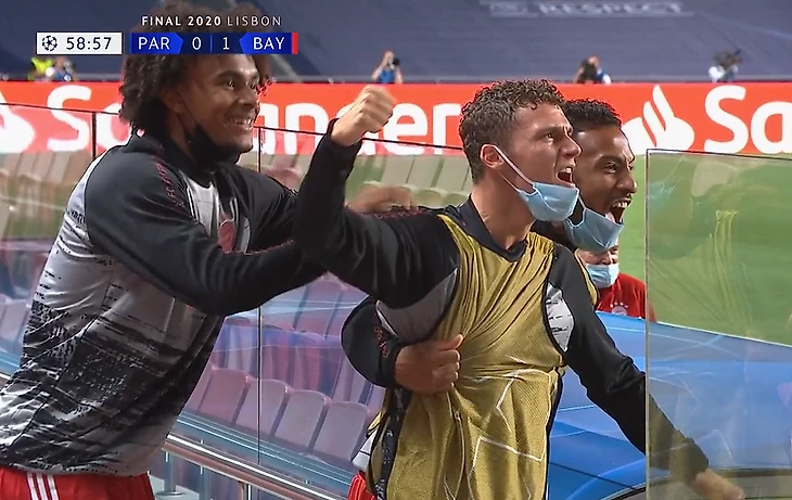 Радость «Баварии» от гола Кингсли Комана – а везде пусто. Лишь небольшая горстка людей могла отпраздновать на трибунах – те, кто работают в клубе.