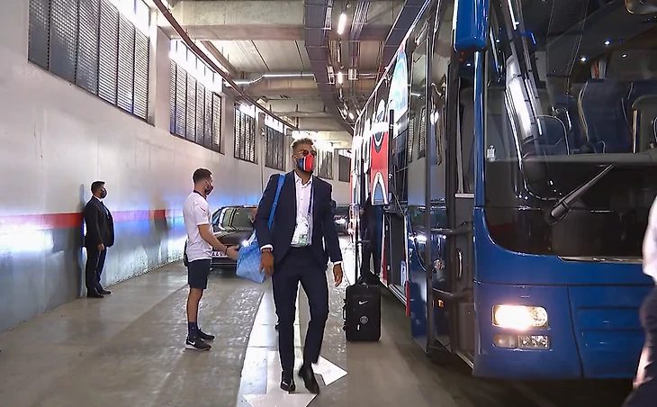 Футболисты выходили из автобусов в масках. Вокруг люди тоже в них.