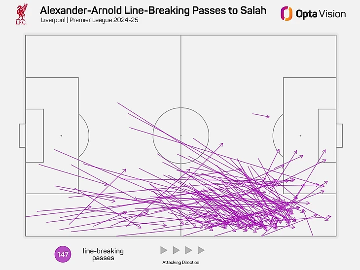 Взаимодействие Салаха и Трента на правом фланге было одним из ключевых аспектов игры «Ливерпуля». Во многом из-за качества передач англичанина на египтянина. В прошлом сезоне Александр-Арнольд отдал 147 прорывных передач (пас, который разрезает оборону соперника и выводит партнера на опасную позицию). Ближайшими преследователями были Гвардиол и Доку из «Манчестер Сити» – 108 таких передач. Именно талант Трента вскрывать оборону соперника своими пасами позволял Салаху получать мяч в опасных позициях.