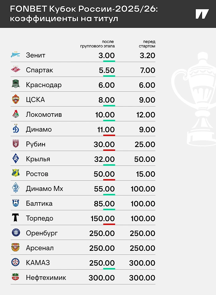 FONBET Кубок России перешел в стадию четвертьфиналов – и там за последние пару недель есть изменения по раскладам: «Зенит» стал еще большим фаворитом против «Динамо», шансы внезапно увеличились и у «Спартака» против «Локомотива».
