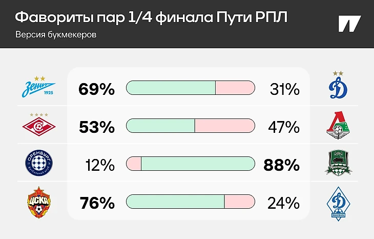 «Зенит» вообще стал явным фаворитом против московского «Динамо»: было 56%, а стало 69%! Команде Валерия Карпина дают всего 31% на выход в полуфинал. Хотя недавно они встречались в Петербурге – хозяева выиграли минимально и не без труда.