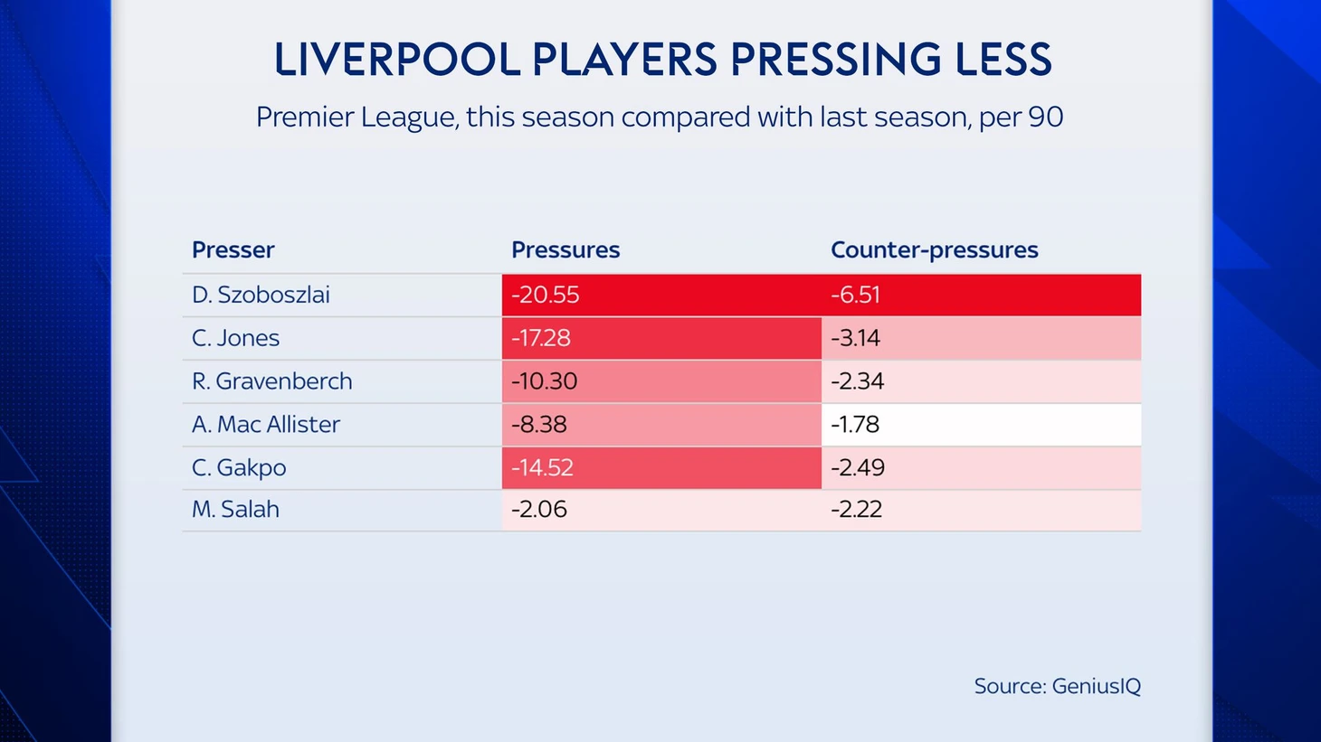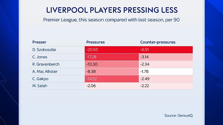 Одной из причин этого можно назвать кадровые перестановки в летнее трансферное окно – обновленному составу необходимо сыграться. Экитике и Виртцу вдобавок адаптироваться в новом чемпионате. Но ведь показатели прессинга и контрпрессинга снизились и у тех игроков, кто уже не первый сезон носит футболку «Ливерпуля». Снижение этих показателей в сравнении с прошлым сезоном «Ливерпуля» приведены ниже.