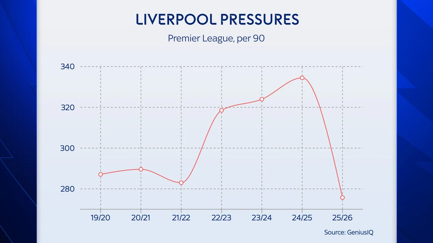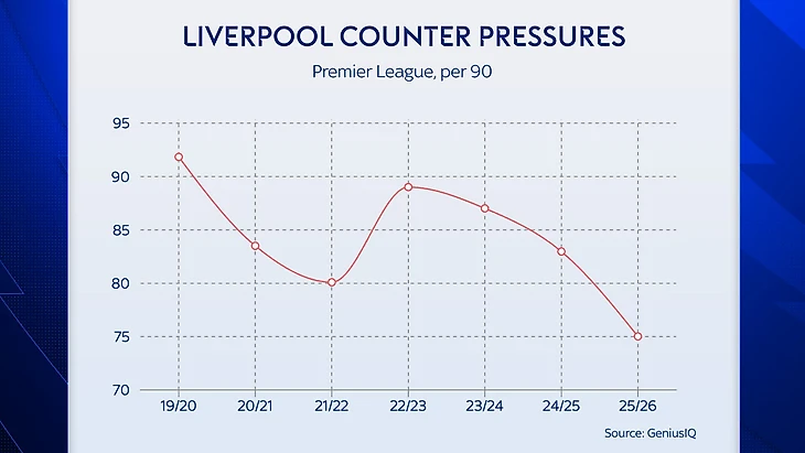 Впрочем, снижение показателя по дистанции у «Ливерпуля» наблюдается не первый сезон. Отмечается, что Слот и вовсе сделал это намерено – отдав предпочтение контролю. Но «Ливерпуль» все равно был эффективен в прессинге. Сейчас же этого не видно. На картинке ниже показано существенное снижение показателей прессинга у «Ливерпуля».