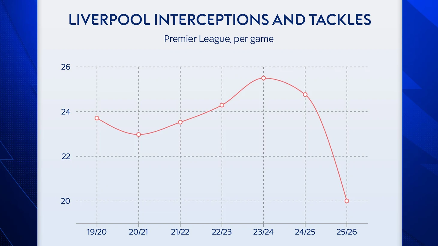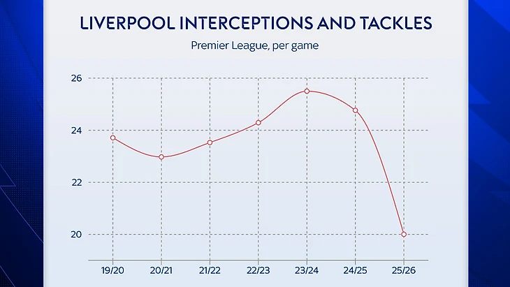 «Ливерпуль» вообще заметно сбавил в игре без мяча. При Клоппе команда славилась интенсивностью и прессингом. В прошлом сезоне спад по игре без мяча у мерсисайдцев был, но не такой заметный. Но в нынешнем сезоне этот показатель игры заметно снизился. На картинке ниже приведена динамика по перехватам и отборам мяча в исполнении «Ливерпуля» за последние сезоны АПЛ.