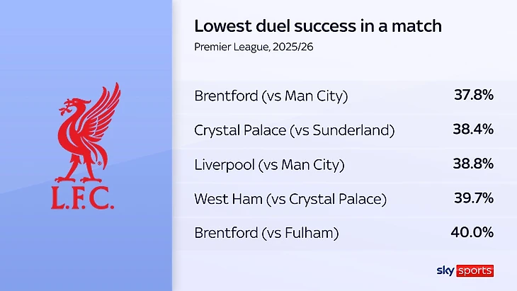 В противостоянии с «Манчестер Сити» мерсисайдцы выиграли лишь 38.8% всех единоборств, что стало третьим худшим результатом в нынешнем сезоне Премьер-лиги. На картинке ниже приведены топ-5 худших показателей по выигранным единоборствам за матч сезона.