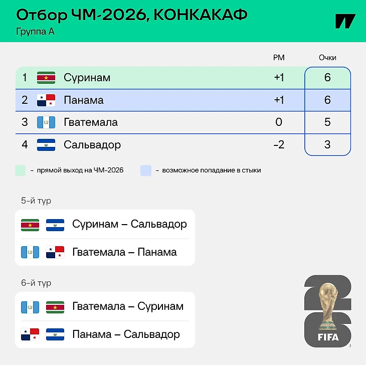 ● Суринам – мини-фаворит на прямую путевку, так как в пятом туре может набить разницу мячей в домашней игре с аутсайдером. Кроме того, у Суринама – микроскопическое преимущество над Панамой за счет гостевого гола в личных встречах (0:0, 1:1). При этом именно разница мячей – приоритетный показатель. Если Панама обыграет соперников крупнее, чем Суринам, то пройдет именно она.