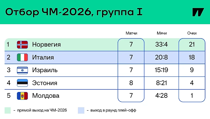 Италия точно не опустится ниже второго места в группе и финиширует выше Израиля, Эстонии и Молдовы. Так что рейтинг Лиги наций в случае с итальянцами считать не придется – они просто будут ждать соперника по полуфиналу по итогам жеребьевки 20 ноября. Сборные распределят по корзинам согласно рейтингу ФИФА.
