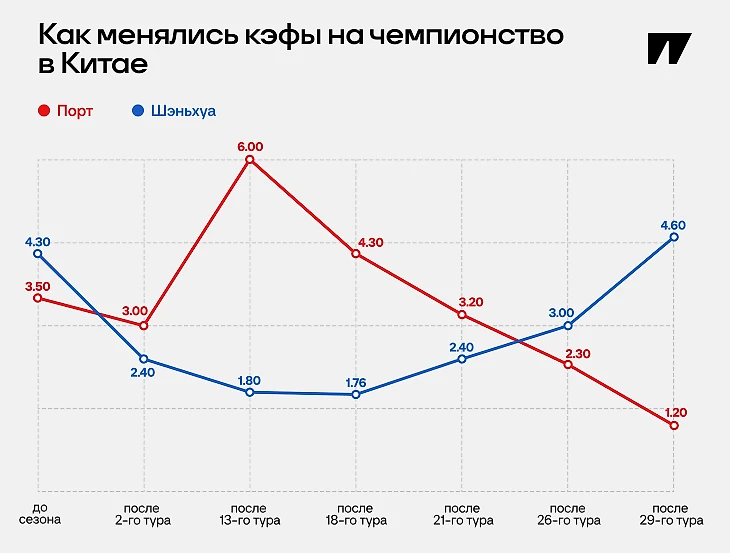На старте видели «Порт» главным претендентом, а «Шэньхуа» котировался вторым. Котировки начали смещаться уже через два тура: команда Слуцкого стала главным фаворитом. Здесь близость к трофею = как можно более низкая точка.