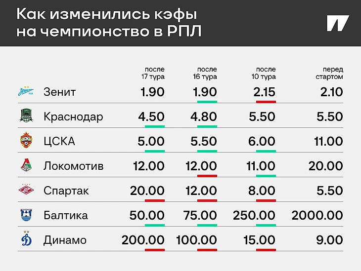 «Зенит», «Краснодар» и ЦСКА сближаются, «Балтика» догоняет «Спартак». Что изменилось после 17-го тура РПЛ у букмекеров