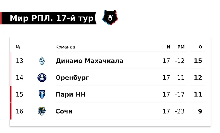 Состав группы аутсайдеров тоже не изменился: «Сочи», «Пари НН», «Оренбург» и махачкалинское «Динамо». Нижегородцы – единственные, кто победил в 17-м туре. Наконец-то прервали восьмиматчевую безвыигрышную серию в РПЛ.