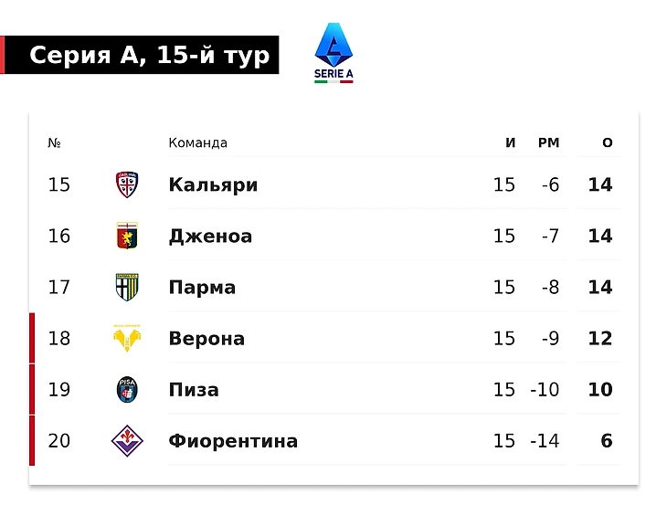 При этом больше коэффициент на титул все равно сразу у шести команд: «Кальяри», «Лечче», «Пармы», «Дженоа», «Пизы» и «Вероны».