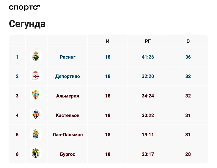 На втором месте внезапно идет «Депортиво», который в прошлом сезоне Сегунды вообще финишировал 15-м. За зону плей-офф цепляются «Кастельон» и «Бургос» – их в элите не было аж с XX века. Однако впереди 24 тура, а плотность в Сегунде мощная, дистанция от второго до восьмого места умещается всего в пять очков.
