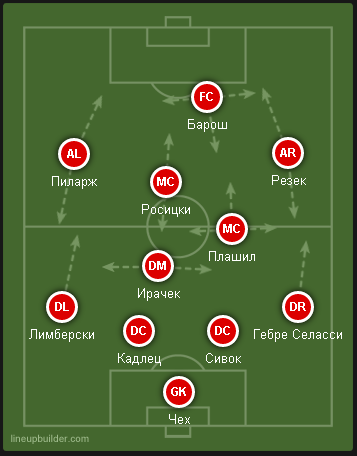 Чешскую сборную вряд ли можно отнести к атакующим командам, однако они способны стремительно перейти на чужую половину поля. Чех частенько выбивает мяч далеко вперед на Бароша (несмотря на то что его вряд ли можно назвать таргет мэном), поддерживаемого очень быстрыми крайними форвардами и Росицки.
