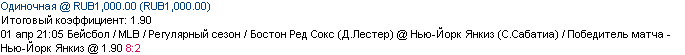 01/04 21:05 Бостон Ред Сокс (Д.Лестер) @ Нью-Йорк Янкиз (С.Сабатиа) / Победитель матча - Нью-Йорк Янкиз @ 1.90 8:2 ---