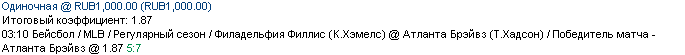 02/04 03:10 Филадельфия Филлис (К.Хэмелс) @ Атланта Брэйвз (Т.Хадсон) / Победитель матча - Атланта Брэйвз @ 1.87 5:7 +++