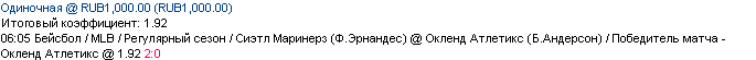 02/04 06:05 Сиэтл Маринерз (Ф.Эрнандес) @ Окленд Атлетикс (Б.Андерсон) / Победитель матча - Окленд Атлетикс @ 1.92 2:0 ---