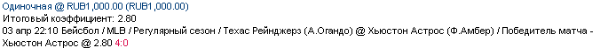 03/04 22:10 Техас Рейнджерз (А.Огандо) @ Хьюстон Астрос (Ф.Амбер) / Победитель матча - Хьюстон Астрос @ 2.80 4:0 ---