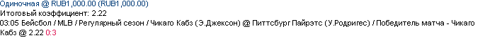 04/04 03:05 Чикаго Кабз (Э.Джексон) @ Питтсбург Пайрэтс (У.Родригес) / Победитель матча - Чикаго Кабз@ 2.22 0:3 ---