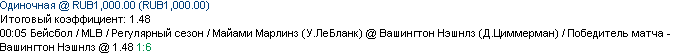 05/04 00:05 Майами Марлинз (У.ЛеБланк) @ Вашингтон Нэшнлз (Д.Циммерман) / Победитель матча - Вашингтон Нэшнлз @ 1.48 1:6 +++