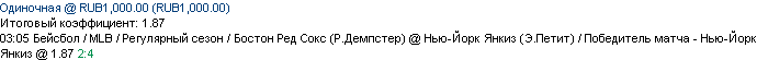 05/04 03:05 Бостон Ред Сокс (Р.Демпстер) @ Нью-Йорк Янкиз (Э.Петит) / Победитель матча - Нью-Йорк Янкиз @ 1.87 2:4 +++