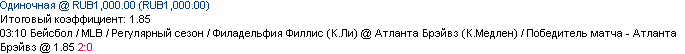 05/04 03:10 Филадельфия Филлис (К.Ли) @ Атланта Брэйвз (К.Медлен) / Победитель матча - Атланта Брэйвз @ 1.85 2:0 ---