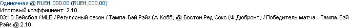 13/04 03:10 Тампа-Бэй Рэйз (А.Кобб) @ Бостон Ред Сокс (Ф.Дюбронт) / Победитель матча - Тампа-Бэй Рэйз @ 2.10 ===