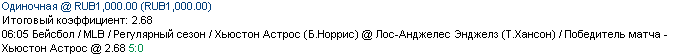 13/04 06:05 Хьюстон Астрос (Б.Норрис) @ Лос-Анджелес Энджелз (Т.Хансон) / Победитель матча - Хьюстон Астрос @ 2.68 5:0 +++