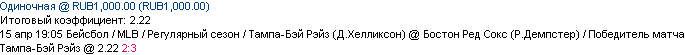 15/04 19:05 Тампа-Бэй Рэйз (Д.Хелликсон) @ Бостон Ред Сокс (Р.Демпстер) / Победитель матча - Тампа-Бэй Рэйз @ 2.22 2:3 ---