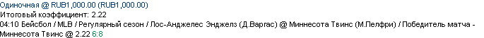 17/04 04:10 Лос-Анджелес Энджелз (Д.Варгас) @ Миннесота Твинс (М.Пелфри) / Победитель матча - Миннесота Твинс @ 2.22 6:8 +++